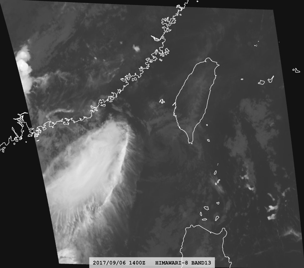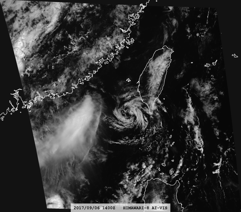 When a developing tropical cyclone is subjected to strong vertical wind shear, deep convection becomes decoupled from the low-level circulation and the storm's intensity steadily diminishes. Once the convection is completely displaced, thermal-infrared imagery can no longer identify the circulation center with confidence, hampering accurate fixes of position and strength. AI-VIS imagery, however, depicts the line-shaped low-level cumulus clouds as crisply as standard visible imagery, so the low-level center stands out at a glance.