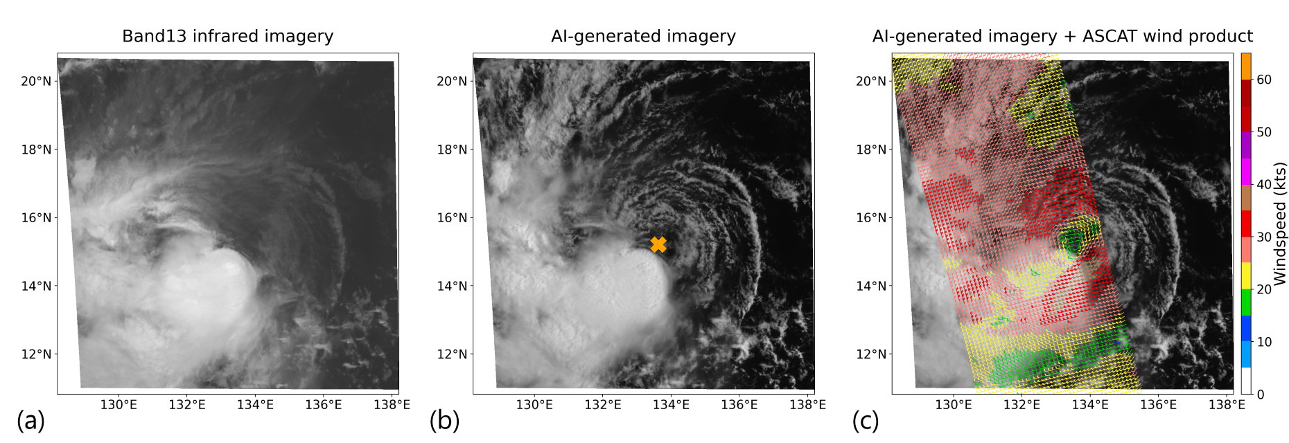 As confirmed by ASCAT wind data, AI-VIS enables us to intuitively view the location of the low-level circulation center of the tropical cyclone. Whereas ASCAT wind data is available only once or twice a day, AI-VIS provides continuous monitoring of the tropical cyclone center.