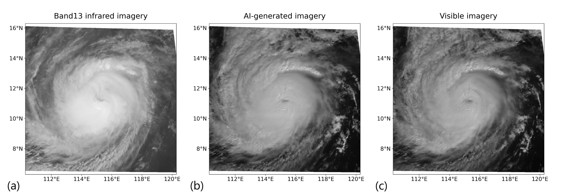 We provide AI-VIS products for three different areas of observation: Mesoscale, Floater, and ROI-Floater. Mesoscale imagery offers high-frequency monitoring over an area ~1,000 km across, typically targeting tropical cyclones or thunderstorms; Floater imagery is centred on any active tropical cyclone or investigative area; ROI-Floater imagery covers the coastal region of China, supporting coastal weather monitoring such as fog detection. Mesoscale and ROI-Floater imagery uses the fixed sunlight direction at 9 a.m. local time, and Floater imagery uses the actual sunlight direction during the day and uses the sunlight direction 12 hours earlier during the night.